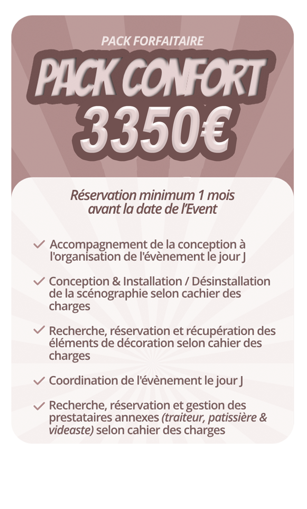 En plus des prestations que t’offrent notre pack « Design », avec le Pack « Confort » tu n’auras plus le souci de devoir chercher et gérer les prestataires « Traiteur » et « Cake Designer »… grâce à notre réseau de professionnelles, nous sélectionnerons et ferons appel à nos meilleures prestataires dans ce domaine qui répondront au mieux à tes attentes pour offrir l’expérience visuelle et gustative que méritent tes clientes..