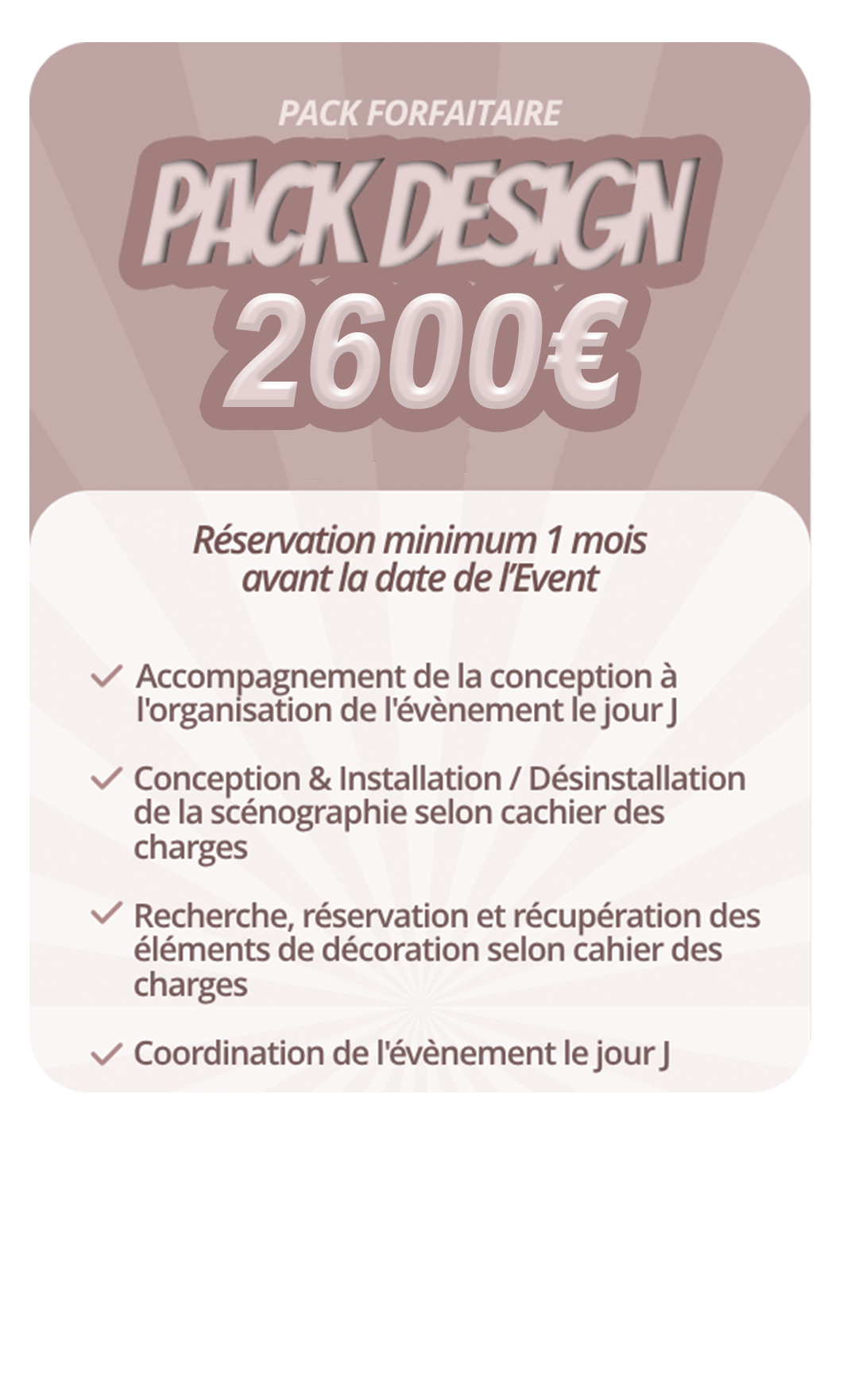 Avec le Pack « Design » tu pourras bénéficier de notre accompagnement dans l’organisation de ton évènement et des différents éléments de décoration nécessaire pour créer la Scénographie qui permettra de faire vivre à tes clientes une expérience cliente immersive dans ton univers de marque..