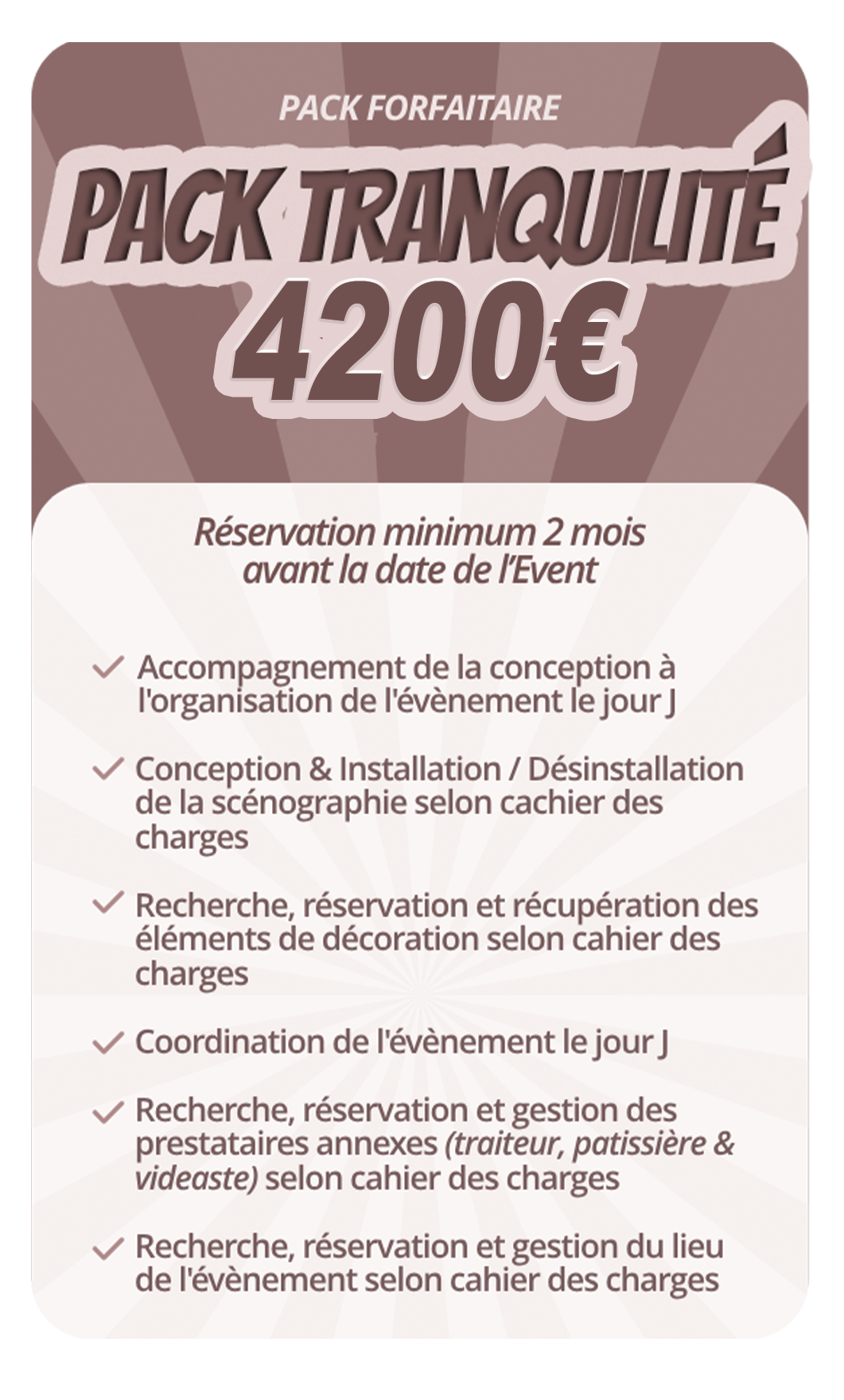 Le pack « Tranquilité » est le pack idéal pour te décharger de toute la charge mentale qu’impose l’organisation d’un Business Event.. Avec ce pack nous serons à tes côtés avant, pendant et après l’événement, de sa conception à sa réalisation, en passant par sa promotion.. De la sélection de l’espace idéal pour couvrir ton événement, en passant par la coordination et la gestion de tous les prestataires et intervenants de ton Event, ainsi que la programmation de cette journée dans le moindre détail pour en faire un moment inoubliable qui marquera les esprits de tes clientes..